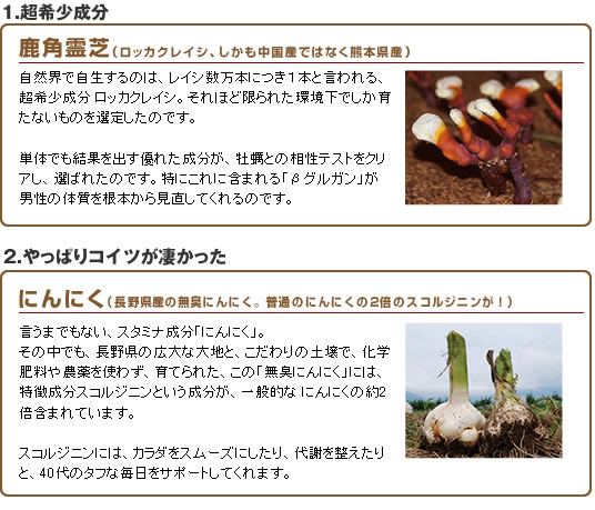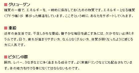 その他にも、アミノ酸類、鉄、カルシウム、銅などのミネラル類、ビタミン類を含んでおり、「踏ん張り続けた体」・「老化を感じる体」にアプローチするのです。