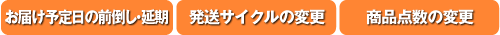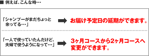 | ご連絡頂ければ、いつでもお届け内容を変更する事ができます。お客様のご都合や商品のご使用ペースに合わせて、ご変更下さいませ。 | ||