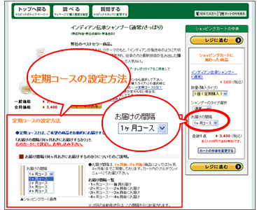 5.数量のプルダウンにて「定期購入」を選択されますと、カート内が広がり、「お届けの間隔」を設定頂くプルダウンが出てきます。 併せて、「定期コースの設定方法」が左面に出て参りますので、ご確認頂きながら、設定をされて下さい。 |