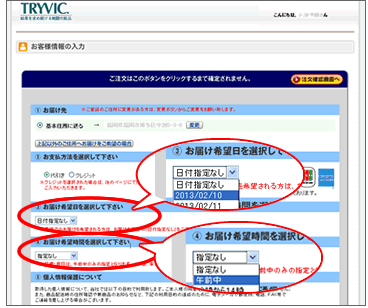 8.通常の注文と同じように、お届け先、支払い方法、 お届け日時などを決めて下さい。 この時、お選び頂いたお日にち、お時間が 次回以降のお届け予定日時となります。 |