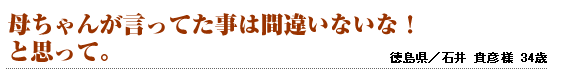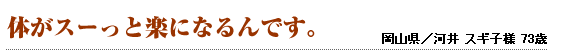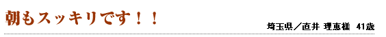 寝る前に飲むだけで、起きるのが辛かった朝がスッキリと迎えられ、食欲も出てくるようになり、今では、元気に過ごせるようになりました。これからも飲み続けたいと思っています。